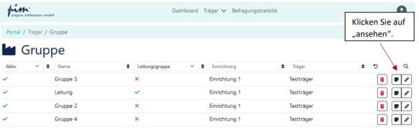 Sie gelangen nun auf die Seite, die alle von Ihnen erstellten Gruppen anzeigt. Wählen Sie nun die Gruppe Ihrer Einrichtung aus, für die Sie Personal erfassen möchten und klicken Sie rechts auf „ansehen“: