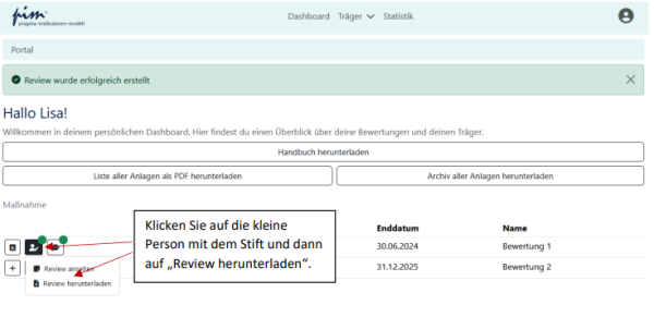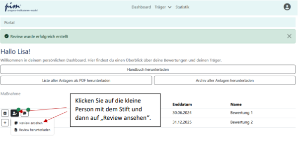 Auf dem Dashboard sehen sie nun auf dem Button für den Review einen grünen Punkt. Wenn Sie den Review ansehen oder bearbeiten möchten klicken Sie erneut auf die Person mit dem Stift und dann in dem sich öffnenden Dropdown-Menü auf „Review ansehen“: