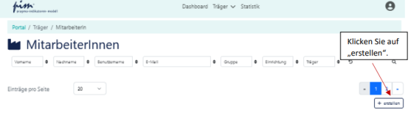 Sie gelangen nun auf die Seite, auf der alle für Ihre Einrichtung erfassten MitarbeiterInnen angezeigt werden. Um neue MitarbeiterInnen zu erfassen, klicken Sie unten rechts auf „+ erstellen“: