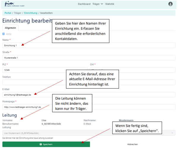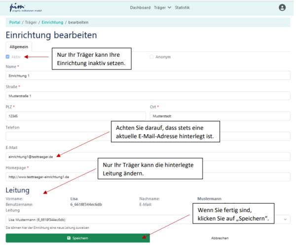 Wichtig: Achten Sie darauf, dass die hinterlegten Daten – insbesondere die E-Mail-Adresse – aktuell sind. Gibt es hier im Laufe der Zeit Änderungen, so geben Sie diese ein. Wenn es Änderungen bei der Person der Leitung gibt, nehmen Sie Kontakt zu Ihrem Träger auf, damit dieser diese erfassen kann.
