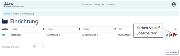 [Bearbeiten]Um die Einrichtungsdaten zu aktualisieren, gehen Sie erneut über das Menü „Träger“ auf „Einrichtungen“. Wählen Sie rechts neben Ihrer Einrichtung das Feld „bearbeiten“ aus: