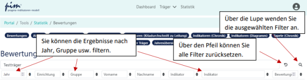 [Bearbeiten]Unter „Bewertungen“ werden Ihnen alle vorgenommenen Bewertungen in einer Liste – jede Bewertung, die jede bzw. jeder MitarbeiterIn zu jedem Indikator in jedem Jahr vorgenommen hat – angezeigt. Sie können diese nach den oben angezeigten Kriterien (z.B. Jahr, Gruppe, Indikator) filtern, indem Sie diese in der oben angezeigten Liste auswählen. Die ausgewählten Kriterien wenden sie über das Lupenzeichen an, über den Pfeil („Filter zurücksetzen“) können Sie alle Filter wieder entfernen: