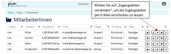 Wichtig: Immer, wenn Sie MitarbeiterInnen über „+ erstellen“ hinzugefügt haben (weil diese neu eingestellt wurden, zurückgekehrt sind oder die Gruppe gewechselt haben), schicken Sie diesen neue Zugangsdaten zu.