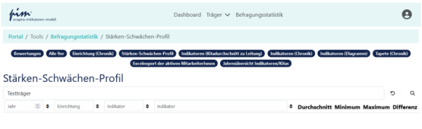 [Bearbeiten]Dies ist eine der aussagefähigsten Auswertungen. Alle Bewertungen der MitarbeiterInnen Ihrer Einrichtung werden zu Durchschnittszahlen für alle Indikatoren zusammengeführt – das StärkenSchwächen-Profil Ihrer Einrichtung; es bildet den IST-Stand Ihrer Einrichtung ab. Dazu werden auch die Differenzen in den von den MitarbeiterInnen vorgenommenen Bewertungen zu jedem Indikator angezeigt, sodass z.B. Unterschiede zwischen den Gruppen bzw. einzelnen MitarbeiterInnen sichtbar werden. Auch diese Ergebnisse können Sie nach Jahr und Indikator filtern: