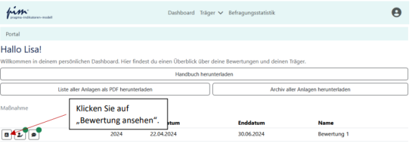 [Bearbeiten]Nach Ablauf der Bewertung können Sie die von Ihnen vorgenommene Bewertung noch einsehen (aber nicht mehr ändern). Klicken Sie hierzu auf dem Dashboard neben der Bewertung auf „Bewertung ansehen“: