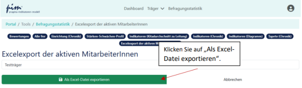 Wichtig: Um einen Überblick über das aktuell erfasste Personal zu erhalten, können Sie unter „Befragungsstatistik“ „Excelexport der aktiven MitarbeiterInnen“ wählen und eine Excel-Tabelle mit dem für Ihre Einrichtung erfassten Personal herunterladen (siehe hierzu Kapitel 4.1).