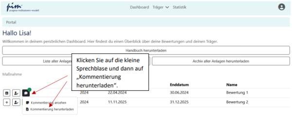 Um Ihre Kommentierung als PDF herunterzuladen klicken Sie erneut auf die Sprechblase neben der Bewertung auf dem Dashboard und wählen „Kommentierung herunterladen“: