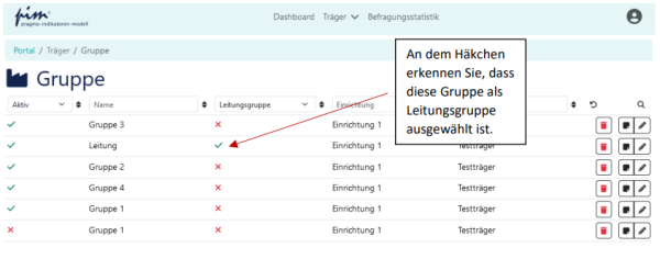 In der Übersicht der Gruppen (unter dem Menü „Träger“/“Gruppen“) erkennen Sie an dem grünen Häkchen, dass eine Gruppe als Leitungsgruppe ausgewertet wird: