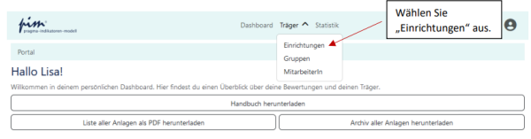 [Bearbeiten]Um die Daten Ihrer Einrichtung zu vervollständigen, gehen Sie oben über das Menü „Träger“ auf „Einrichtungen“: