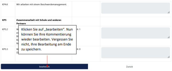 [Bearbeiten]Nachdem der Bewertungszeitraum abgeschlossen ist können Sie die Ergebnisse Ihrer Einrichtung einsehen (Kapitel 4.1), eine Kommentierung zu der Bewertung (Kapitel 4.2) und einen Review erstellen (Kapitel 4.3). Außerdem können Sie ihre eigene, abgeschlossene Bewertung einsehen (Kapitel 4.4).