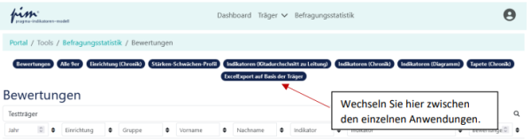 [Bearbeiten]Nach Ablauf des Bewertungszeitraums können Sie aus der Datenbank verschiedene Auswertungen erhalten, die aussagekräftig den IST-Zustand Ihrer Einrichtung darstellen. Gehen Sie hierzu oben rechts auf „Befragungsstatistik“: