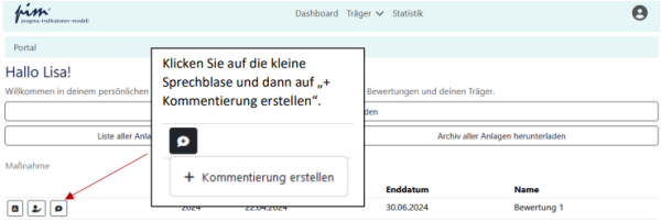 [Bearbeiten]Zu jeder Bewertung können sie eine Kommentierung erstellen. Klicken Sie hierzu auf dem Dashboard auf das rechte Symbol (die kleine Sprechblase) neben der betreffenden Bewertung und dann auf „+ Kommentierung erstellen“: