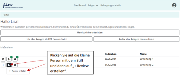 [Bearbeiten]Zu jeder Bewertung können Sie auch einen Qualitätsbericht (Review) erstellen. Diesen kann auch Ihr Träger einsehen. Klicken Sie hierzu auf dem Dashboard auf das mittlere Symbol (die kleine Person mit dem Stift) neben der betreffenden Bewertung und dann auf „+ Review erstellen“: